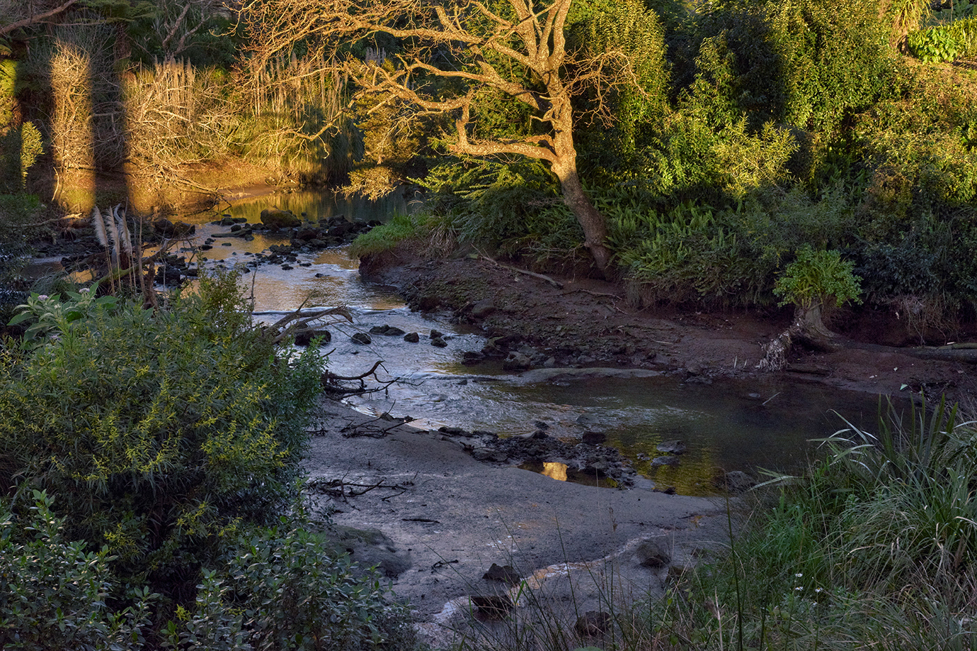 It’s a place of the unexpected. Kawakawa, karaka, kahikatea: is there a shade of green absent in the palette of this ravine? Suddenly there can be a pair of ducks, struggling upstream over tiny rapids to rest within a pool of their own; next moment the deep-throated rasp of a heron high in a pine tree is a sentinel to the setting sun.